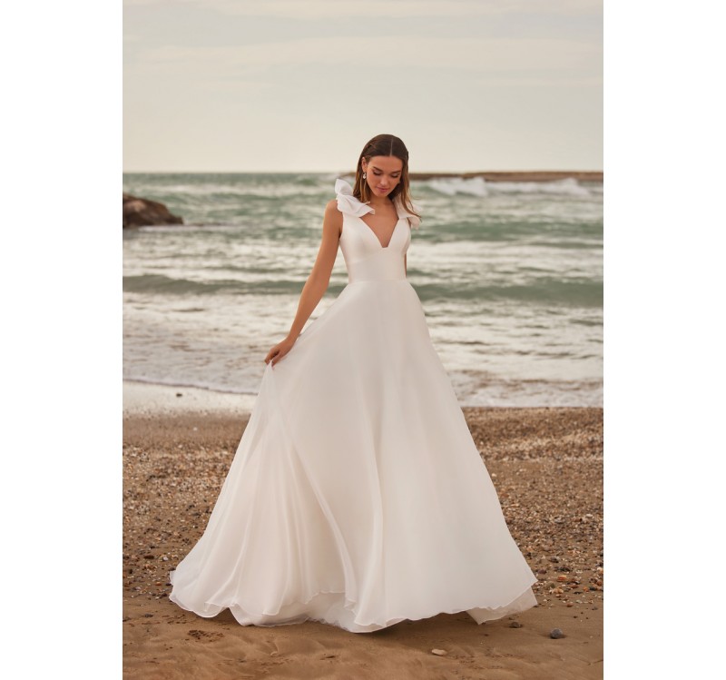 Un abito essenziale e sofisticato, perfetto per la sposa che desidera un look leggero e raffinato. La linea A valorizza la figura mentre il tessuto in organza assicura un’eleganza senza tempo.