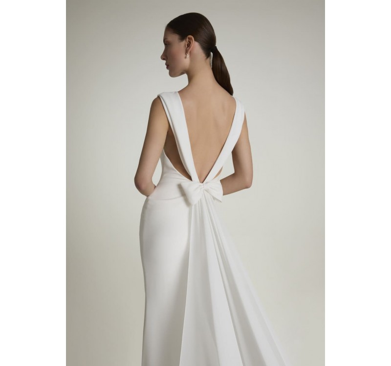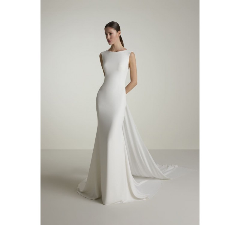 Questo abito in crêpe è la scelta perfetta per la sposa che desidera un look sofisticato e seducente. Il taglio a sirena e la scollatura a barca scolpiscono la silhouette con eleganza.