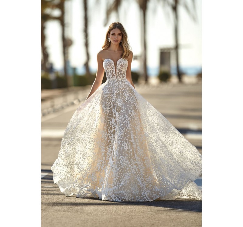 La scollatura parola d'onore dona un’aria raffinata e senza tempo. Il punto vita segnato valorizza la figura mentre la gonna leggera e fluida è impreziosita da una maestosa coda di 170 cm.