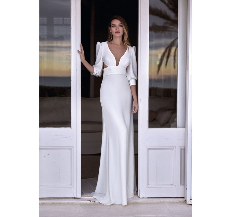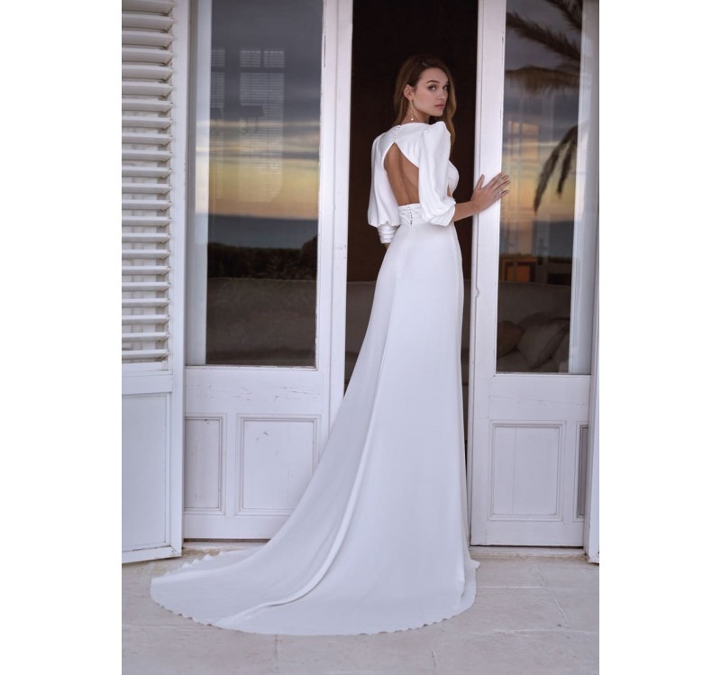 Per la sposa che ama la semplicità, questo abito dalla silhouette svasata è la perfetta fusione tra eleganza e modernità. Realizzato in morbido crêpe, valorizza le forme senza rinunciare al comfort.