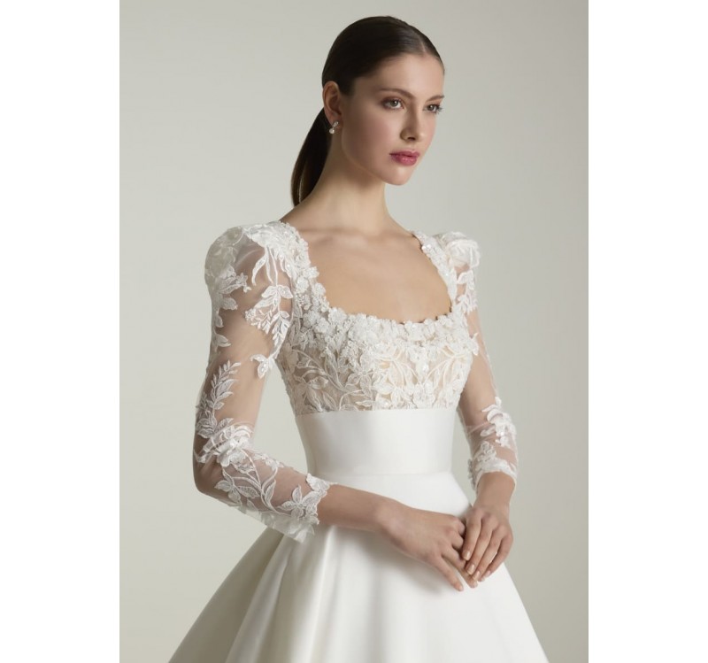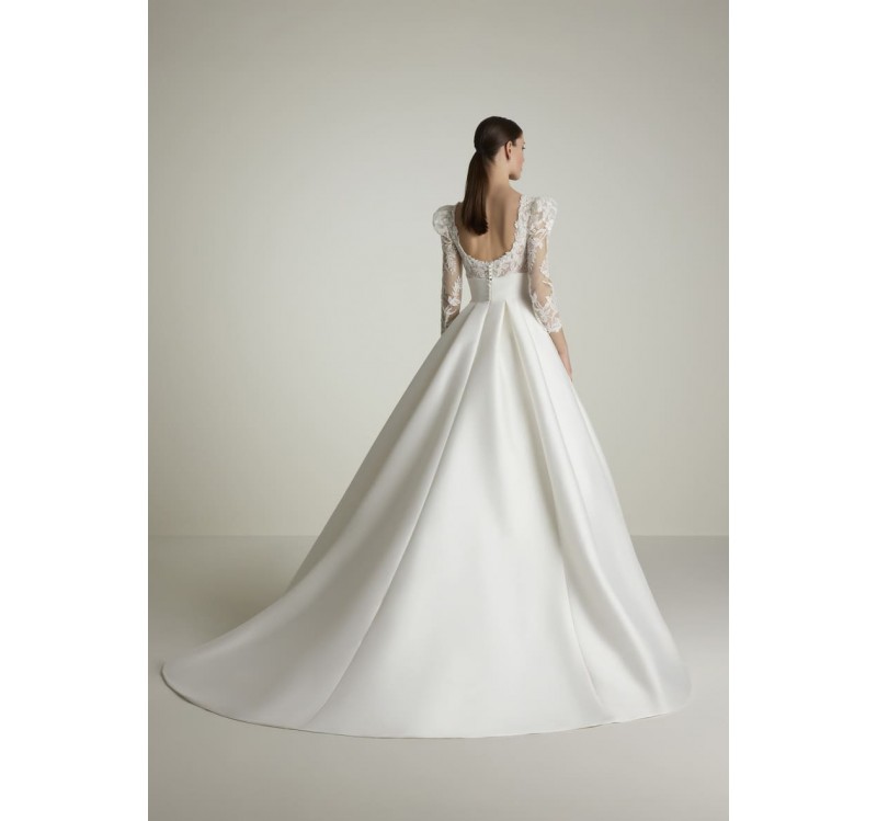Le maniche a tre quarti, leggermente a sbuffo sulle spalle, aggiungono un dettaglio romantico. La coda di 190 cm completa il look, perfetto per una sposa che sogna un ingresso scenografico e indimenticabile.