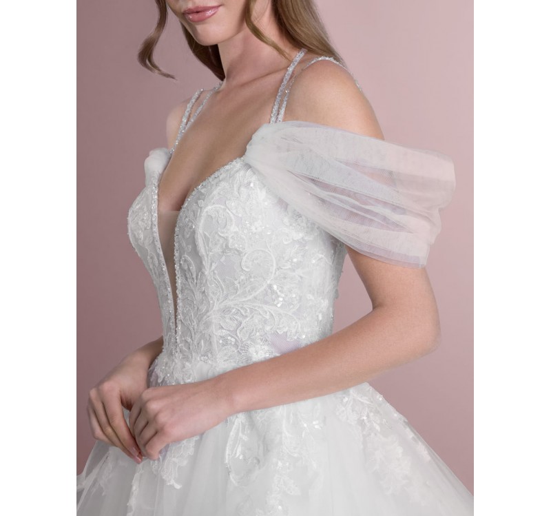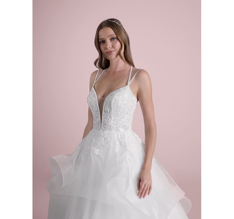 Lasciati incantare da questo abito da sposa taglio principessa, dove romanticismo e modernità si incontrano in un modello unico. La gonna in tulle, impreziosita da un doppio strato di volant asimmetrici, crea un effetto scenografico raffinato e festoso.