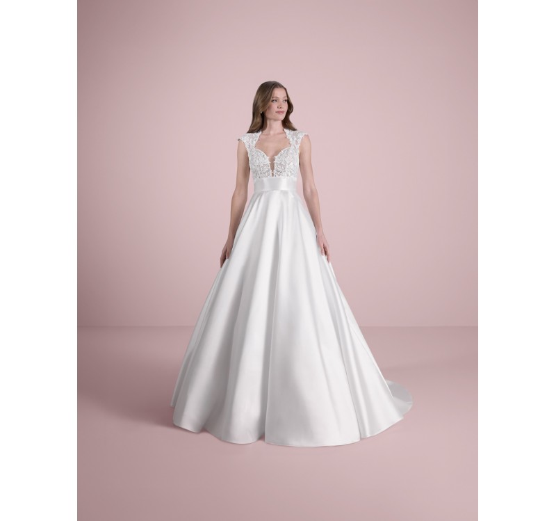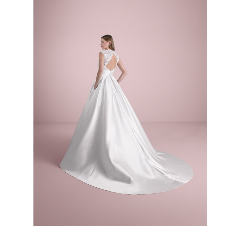 Lo scollo a cuore esalta il décolleté con dolcezza mentre la gonna in mikado mette in risalto il punto vita. La scollatura a diamante sulla schiena è chiusa da una fila di romantici bottoncini che aggiungono un tocco di classe e sensualità.