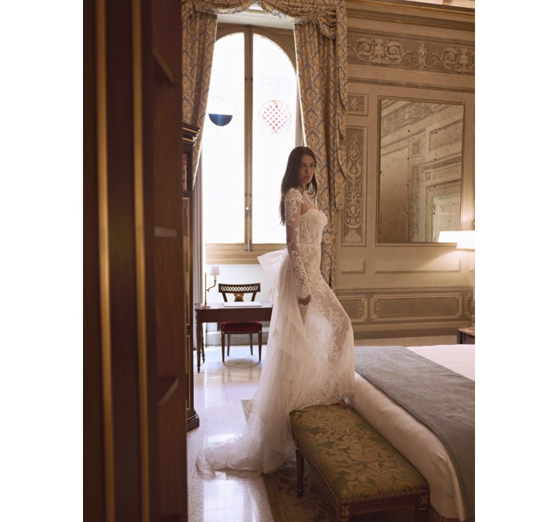 Questo abito da sposa incanta con il pizzo chantilly francese e i ricami relizzati a mano con la tecnica lisage a telaio.