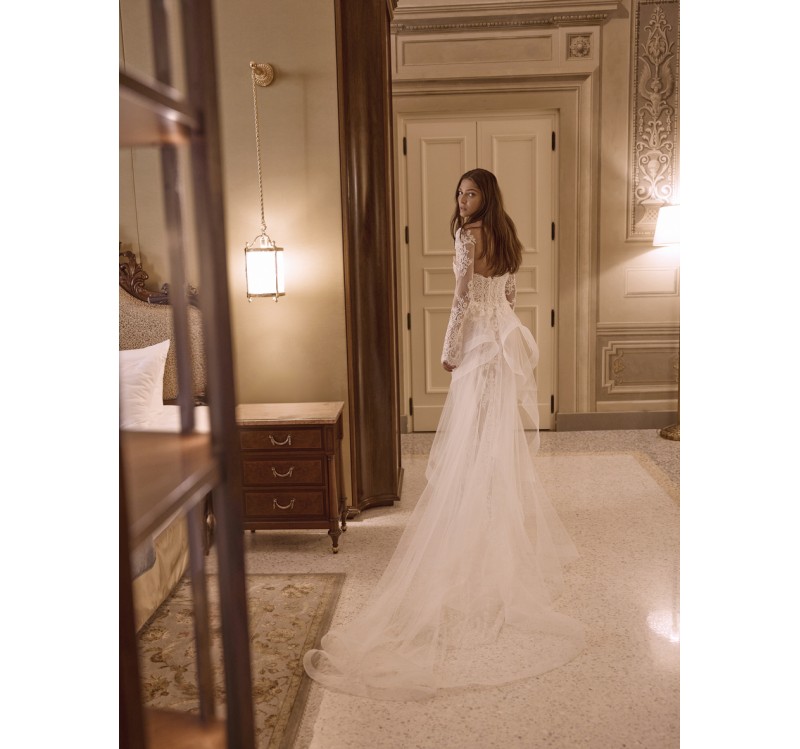 La scollatura décolleté e il taglio in vita valorizzano la silhouette con eleganza. I dettagli trasformabili rendono questo modello incredibilmente versatile. Il raffinato bolerino coordinato aggiunge un tocco di classe mentre la sopragonna in tulle e pizzo crea un suggestivo gioco di volumi.