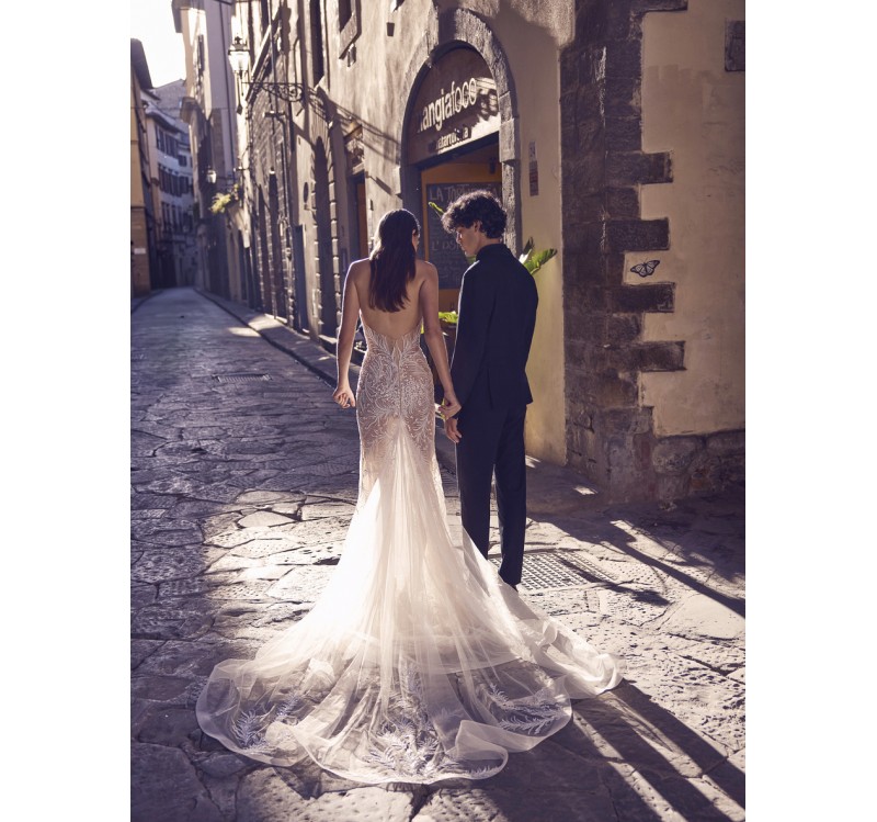 Un abito pensato per la sposa che desidera un look raffinato e sensuale. La base in tulle di seta è impreziosita da un ricamo a telaio in cotone che crea un moderno motivo floreale ramage. I dettagli luminosi in cristalli Swarovski e micro paillettes colore off white satinato donano un effetto scintillante.